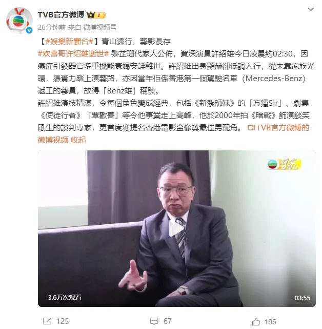 10月28日,据中国新闻网消息,资深艺人许绍雄因癌症致器官衰竭,28日凌晨安详离世。这位港剧“金牌绿叶”,以“欢喜哥”“朱聪”等经典角色陪伴几代人,用半世纪演艺诠释“角色无大小”。