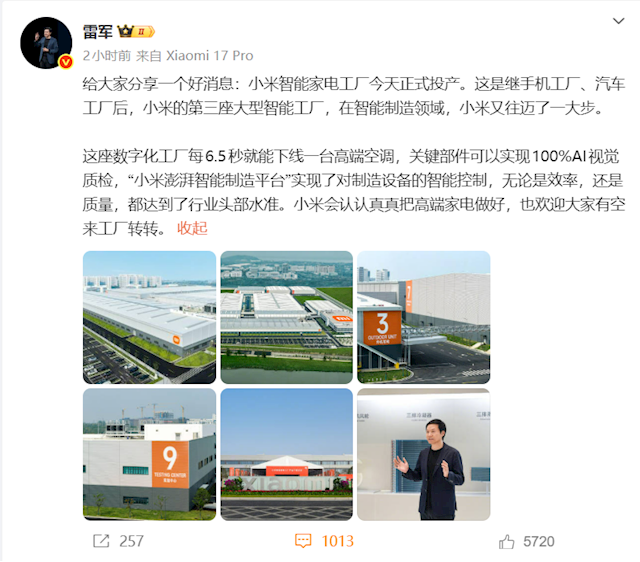 这意味着小米手机、汽车、大家电全部实现了自研自产,更代表着在智能制造领域,小米又往迈了一大步。