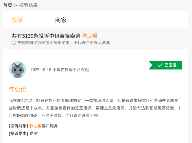 PChome了解到,作业帮近年来陷入了一系列争议。其学习机被指存在过度推销问题,用户购买后会频繁收到电话和微信语音推销课程,甚至在深夜也不例外,涉嫌违反个人信息保护法。此外,作业帮还被投诉存在虚假宣传,如学习机宣称的“护眼书写”“精准批改”等功能,实际使用中却频现误判、卡顿等问题。付费课程质量也遭质疑,存在教学内容不足、退费机制复杂等情况。在黑猫投诉平台上,针对作业帮的投诉量超5100条,投诉问题还包括售后差、自动扣费、隐私骚扰等。
