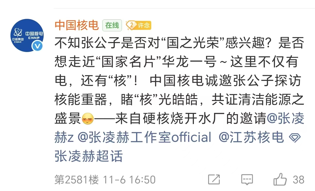 中国华能、中国核电也在评论区邀请张凌赫去前去探访。
