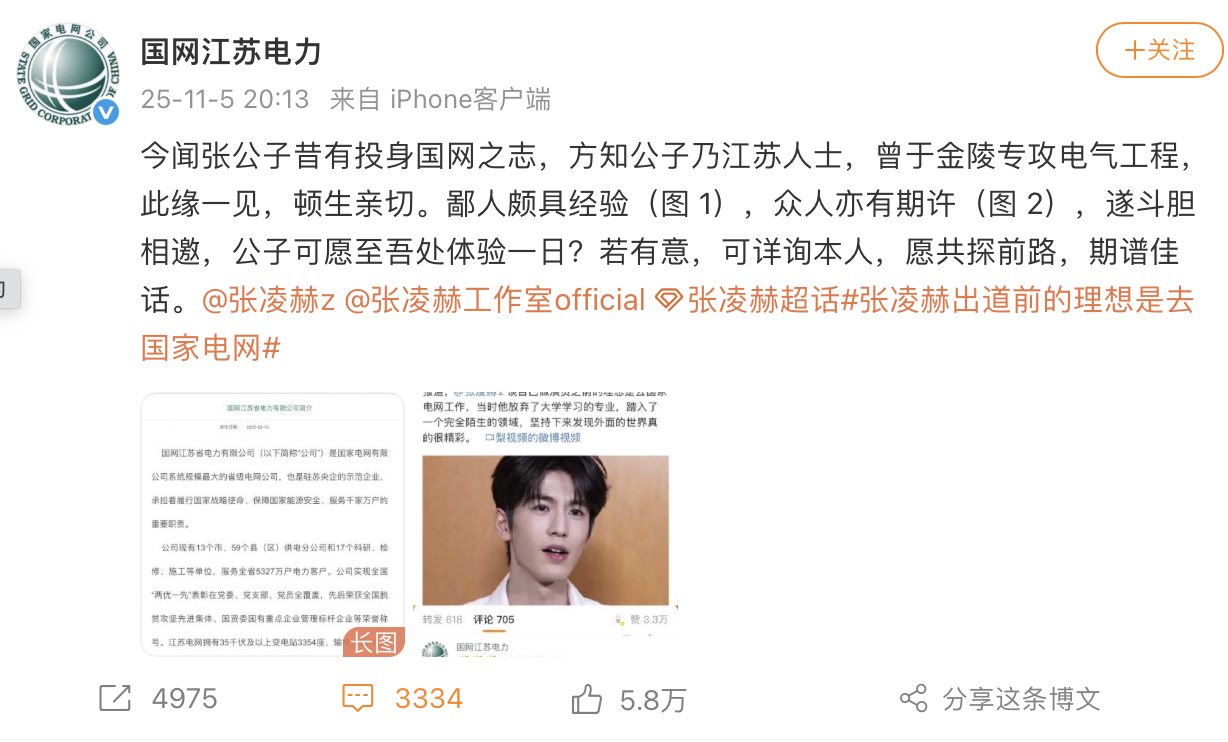 国网江苏电力官方微博11月5日晚间发文,邀请张凌赫去公司体验。