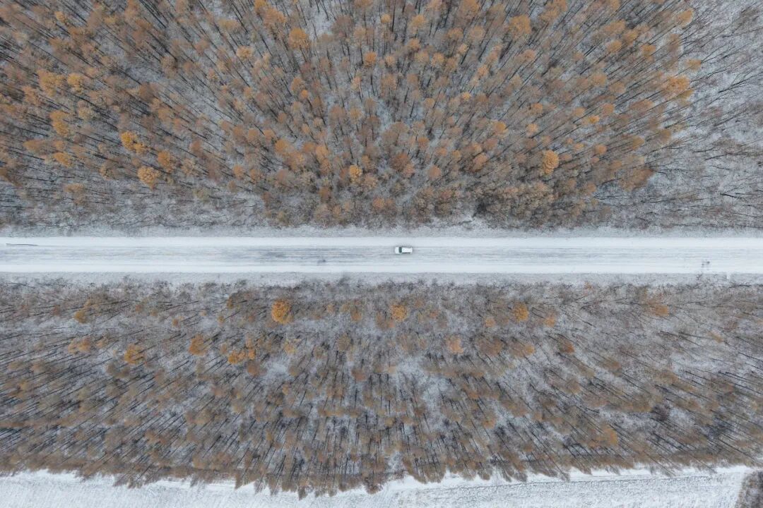11月6日,车辆在G331国道嘉荫段的林海雪原间行驶(无人机照片)。新华社记者 谢剑飞 摄