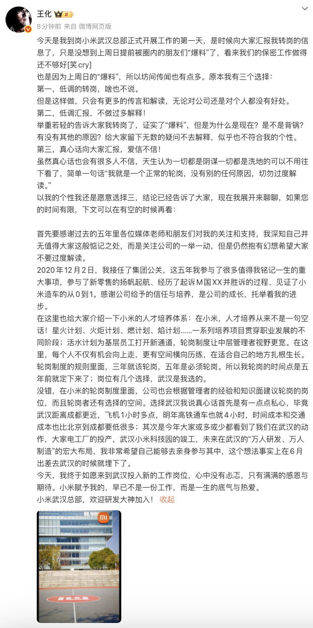 王化表示:“今天是我到岗小米武汉总部正式开展工作的第一天,是时候向大家汇报我转岗的信息了,只是没想到上周日提前被圈内的朋友们‘爆料’了,看来我们的保密工作做得还不够好。