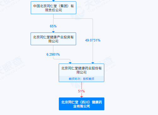 北京同仁堂(四川)药业的控股股东为北京同仁堂健康药业股份有限公司,持股比例51%,后者同样为北京同仁堂集团的孙公司。天眼查显示,目前北京同仁堂集团直接持股49.0731%,并通过北京同仁堂健康产业投资有限公司间接持股6.2981%。