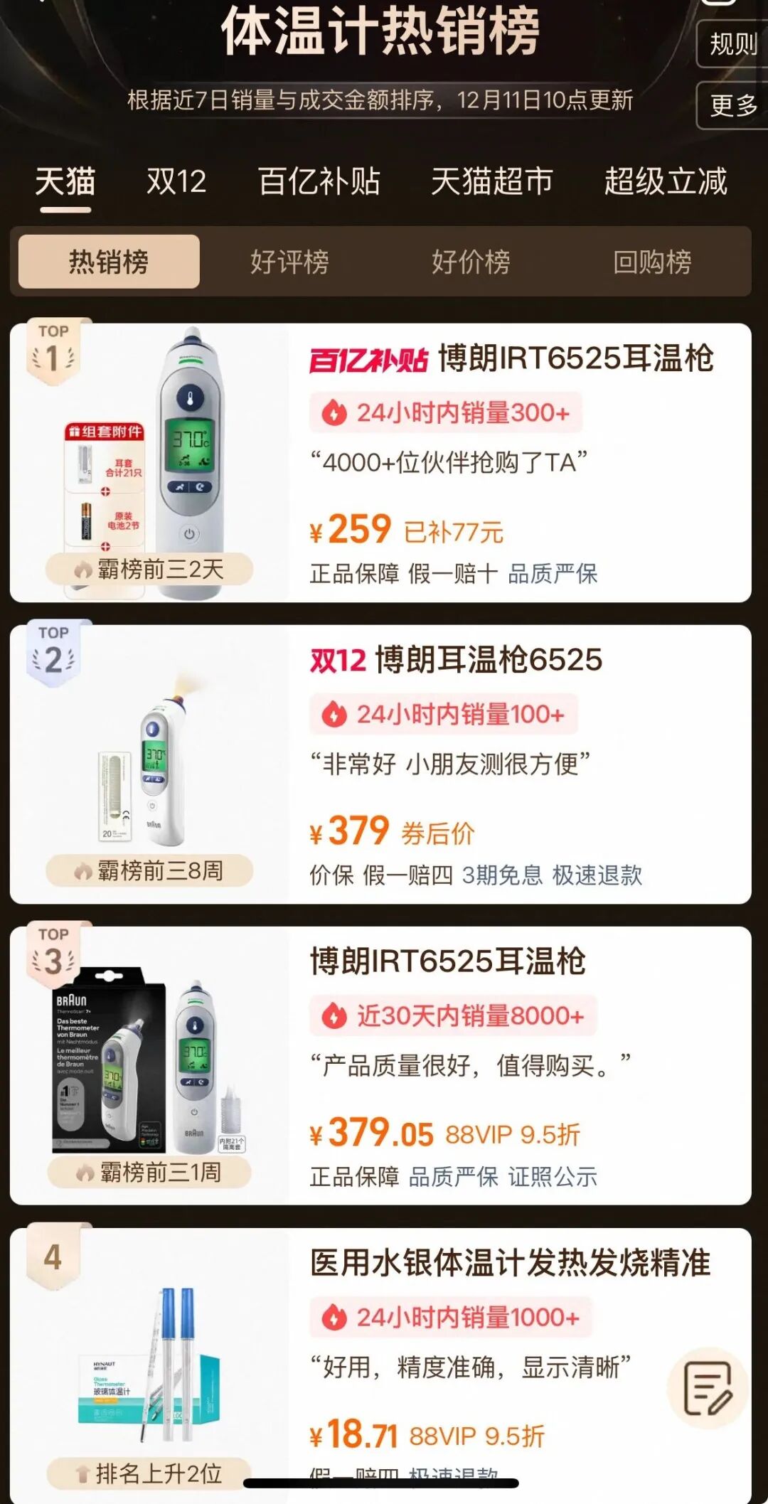 有意思的是,虽然社交平台上充满了网友对水银体温计的不舍,但在购物平台的“体温计热销榜”上,价格更高但使用更便捷的耳温枪占据着榜单的前三位;在“好评榜”上,位列榜首的也是一款耳温枪婴儿体温计,并非被称为“童年记忆”的水银体温计。