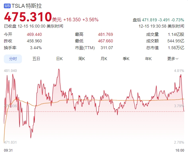 然而,在这片黯淡的市场中,特斯拉却成为了一抹亮色。其股价逆势上涨3.56%,市值一夜之间增加了537亿美元,折合人民币高达3786亿元,展现了强劲的市场表现。