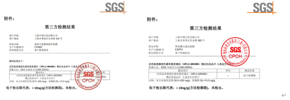 对此,韩束方面向南都记者表示:“我司旗下所有产品,均未添加表皮生长因子成分。”并向南都记者出示了两款涉事面膜的检测报告,报告均显示“未检出”人表皮生长因子。韩束方面告诉南都记者,针对报道中提及的两款面膜检出“表皮生长因子”,此前上海市药品监督管理局稽查局,已就该产品开展了现场核验与检测,同时为客观公允性,我司与市药监局进行了双向送检,结果均显示:送检样品中均未添加表皮生长因子成分。
