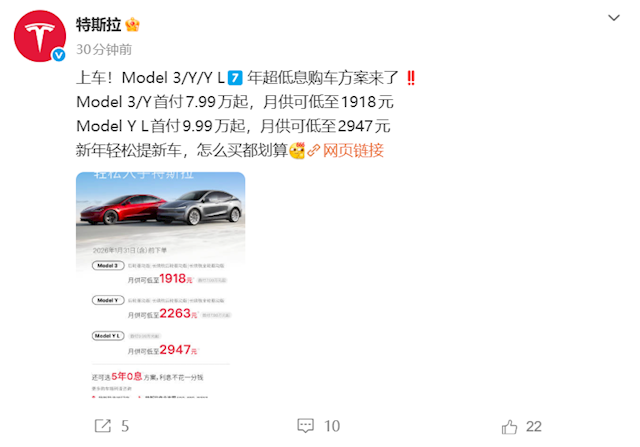 Model Y首付7.99万起,月供可低至2263元;