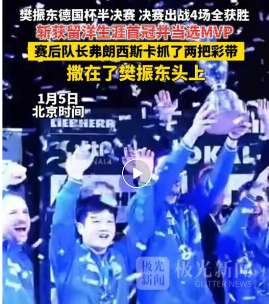 当地时间1月4日,樊振东所在的萨尔布吕肯俱乐部以总比分3-1战胜富尔达马伯策尔俱乐部,夺得德国杯冠军。樊振东贡献2分,收获个人留洋生涯首冠并当选MVP。