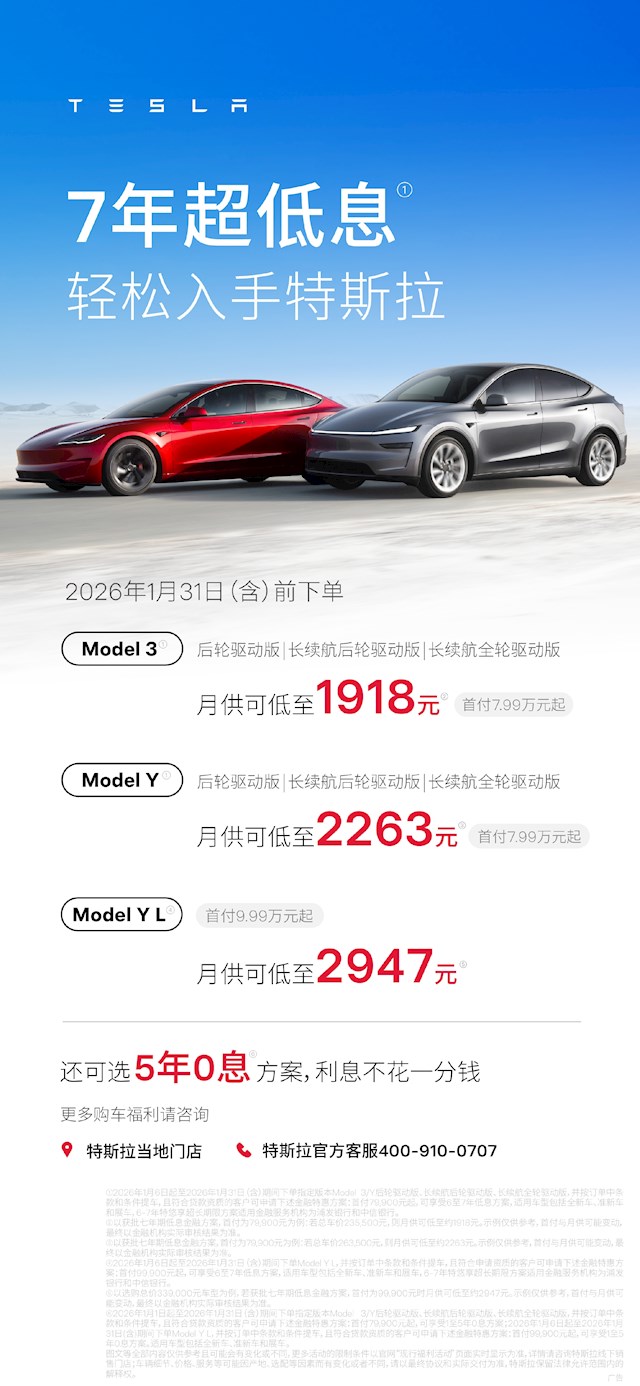 快科技1月6日消息,特斯拉今日发布多款车型的购车金融政策,包含7年超低息、5年0息等方案。