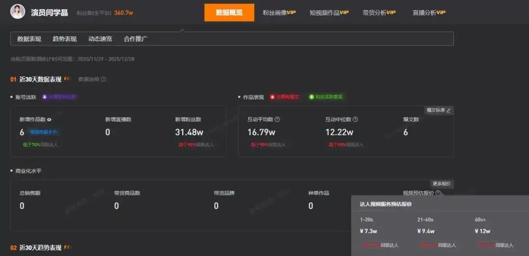 第三方平台数据显示,闫学晶的某社交平台账号名为“演员闫学晶”,近期新增了31.48万粉丝,总粉丝数为360.7万,其1到20秒视频广告预估报价7.3万元,21到60秒视频广告预估报价9.4万元,60秒以上视频广告预估报价为12万元。