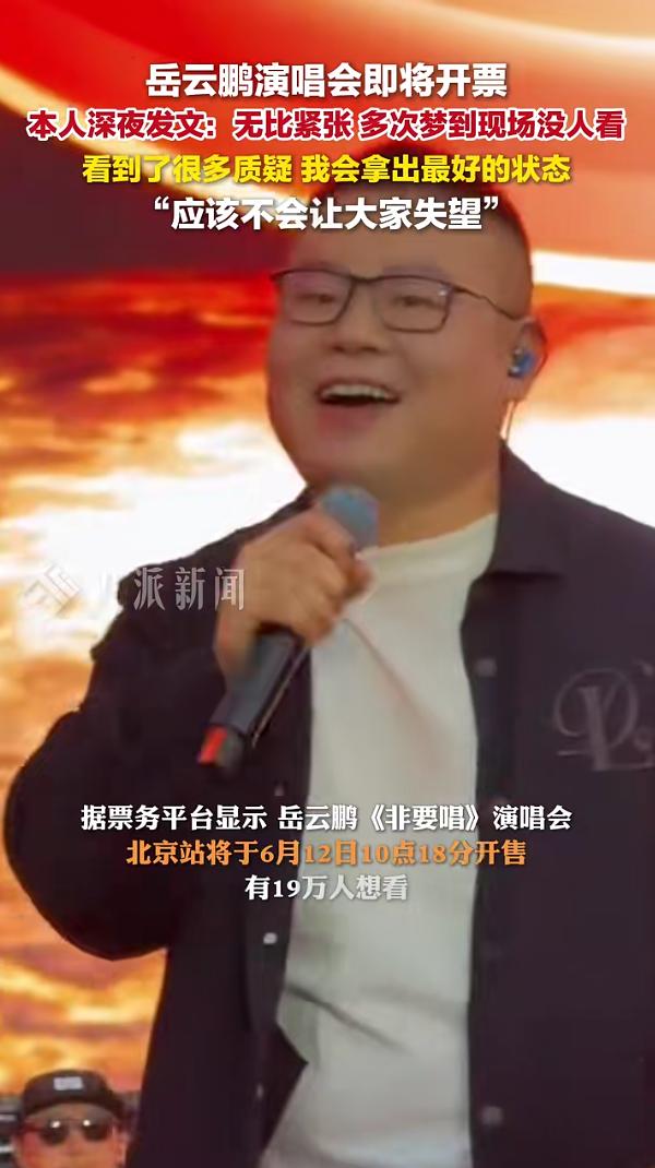 2025年5月,岳云鹏宣布将举办个人巡回演唱会,演唱会定名为“非要唱”。“相声演员开演唱会”的相关话题曾也引发热议。6月11日,该巡回演唱会首站北京站门票在大麦网已进入预约抢票状态,并显示倒计时,6月12日10点18分开抢。