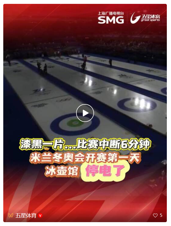 据五星体育,米兰冬奥会冰壶混双首轮开战仅6分钟,现场就遭遇突然停电事故,造成直播中断和比赛暂停,直到约6分钟之后,电力供应才恢复。