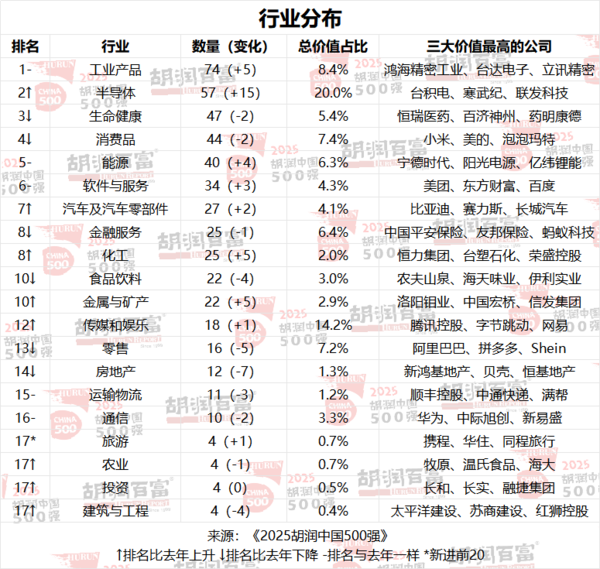 从行业维度看,以台积电、寒武纪、联发科技为首的半导体行业成为年度最大亮点,整体价值增长最为显著,已经超越生命健康行业,跃升为500强企业中的第二大价值行业,工业产品行业仍位列第一。