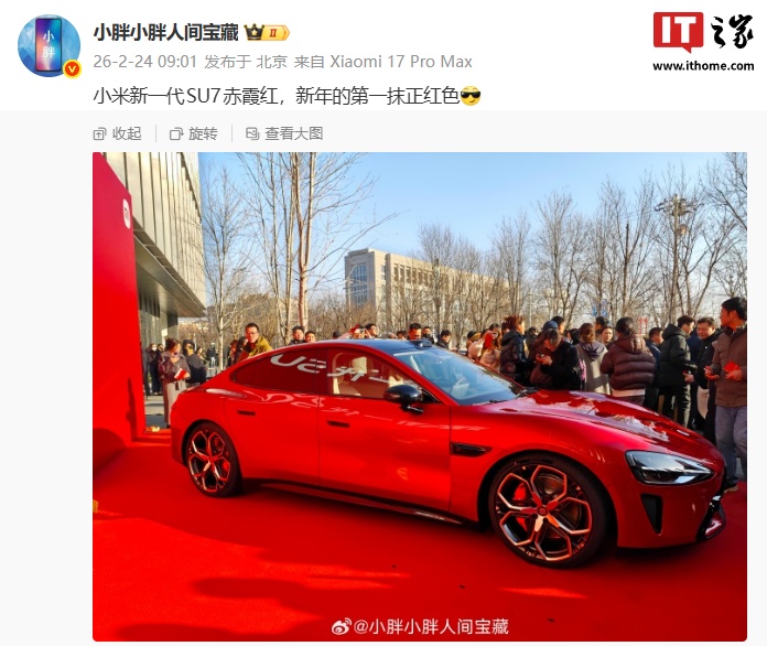 小米集团高级传播经理 @小胖小胖人间宝藏 今日也分享图片,展示了新一代 SU7「赤霞红」的其他角度外观,宣称“新年的第一抹正红色”。