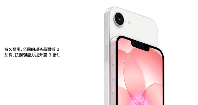 机身采用铝金属边框+超瓷晶面板2,抗刮划能力较iPhone 16e提升3倍,耐用性有所增强。