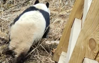 ▲大熊猫在九寨沟景区长海一处栈道悠闲“散步”