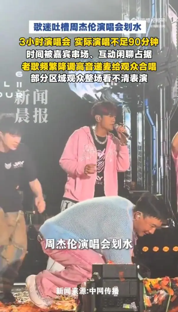 据众多粉丝反馈,整场演唱会实际安排与预期有较大落差。宣传中的3小时演出,周杰伦个人实唱部分被指不足90分钟,其余大量时间被嘉宾串场、VCR播放、点歌环节以及互动闲聊所占据。有观众特别提到,在点歌环节甚至出现了推销未背熟歌词的新歌的情况。