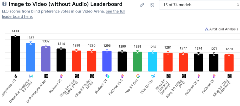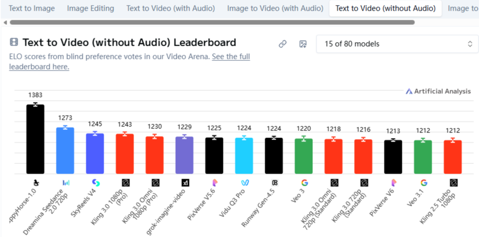 公开资料显示,Artificial Analysis的榜单采用盲测机制,让用户在不知模型来源的情况下对生成视频进行对比选择,并通过类似国际象棋的ELO评分系统汇总结果,形成基于真实用户偏好的排名体系。