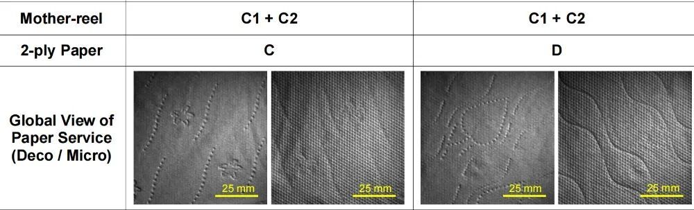 这里有必要对表格数据进行一下说明,Mother reels(A1+A2)表示的是没有经过压花工艺处理的A1、A2两层纸叠在一起的对照组。而Paper A指的是A1、A2经过压花工艺处理之后叠在一起制成的纸(B、C也同理),D和C使用的是同样材质的纸,但压花的图案不一样。