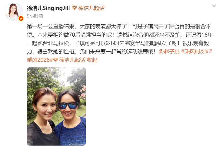 4月11日,徐洁儿发文回应赵子琪被淘汰:“第一场一公直播结束,大家的表演都太棒了!可是子琪离开了舞台真的是很舍不得。本来要相约做70后唱跳担当的呢!遗憾这次合照都还来不及拍。还记得16年一起跑台北马拉松,子琪可是可以2小时内完赛半马的超级女子呀!很乐观有毅力,很喜欢她的性格。我们未来要一起常约运动跳舞哦!”