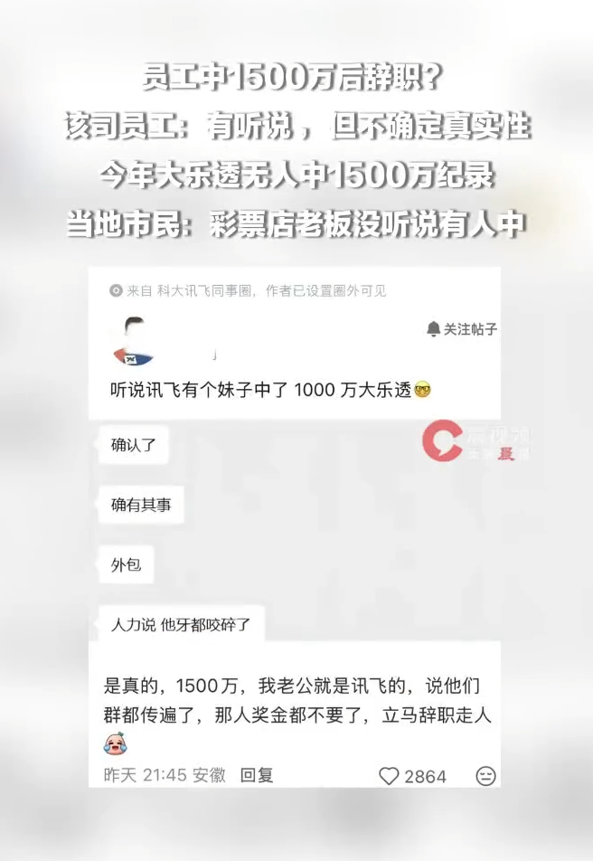 近日,“科大讯飞某员工中1500万彩票后立即离职”的消息引发网友热议。