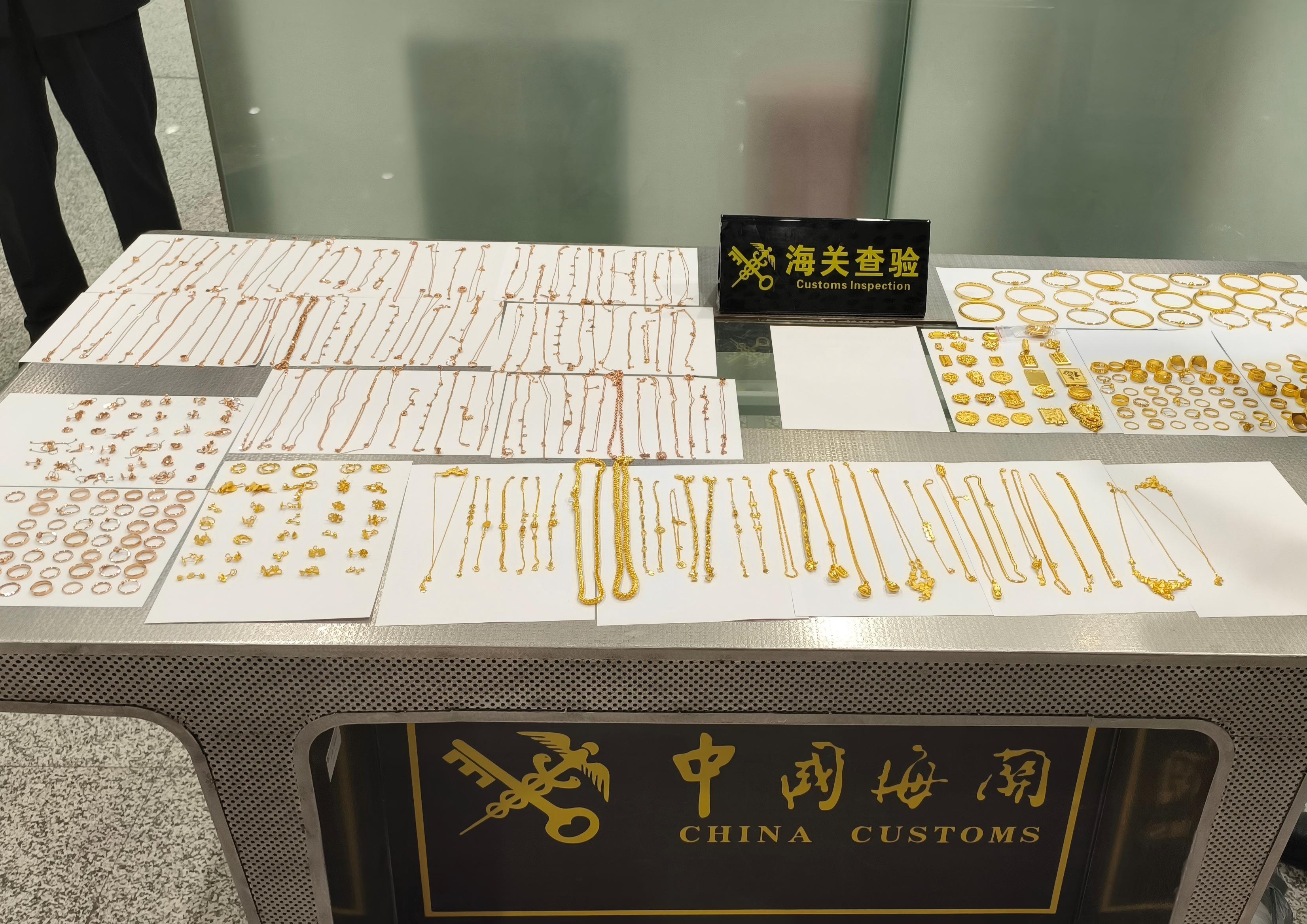据介绍,2025年3月,深圳宝安机场海关在对一趟深圳出境航班进行行李查验时,发现楼某、李某等3名旅客未向海关申报,在随身行李和托运行李中夹带手镯、戒指等黄金饰品近400件,总重达2.8千克,明显超出合理自用范围。面对询问,相关3人回答前后矛盾,疑点重重,海关立即将线索通报机场海关缉私分局。