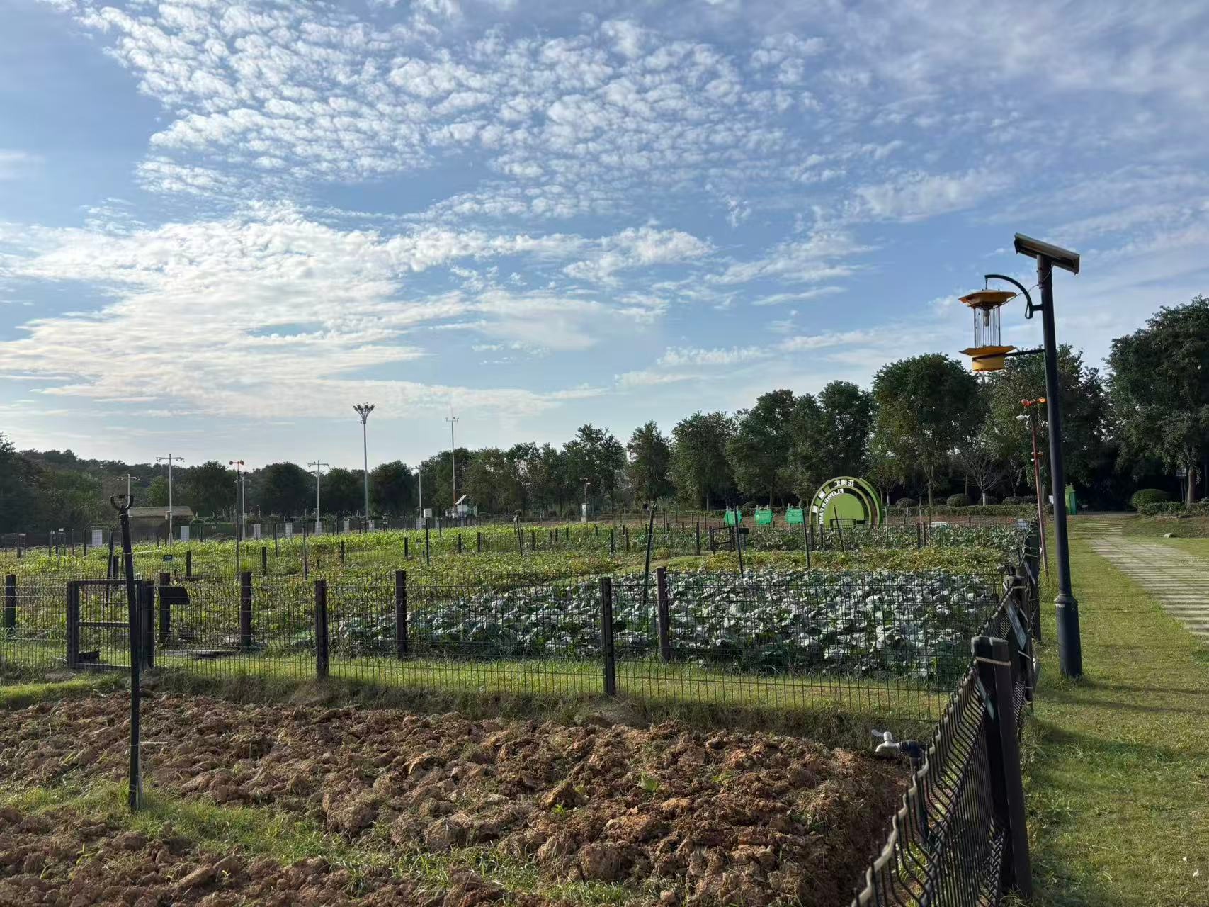 走进市民农园,可见一块块整齐的田地上长满各类蔬菜和作物。每块地都用栅栏围起,标注编号,并配有监控和浇水设备。田地周边,绿草如茵,过道整洁。远处还有粉黛花海、湖泊、绿道等景观。