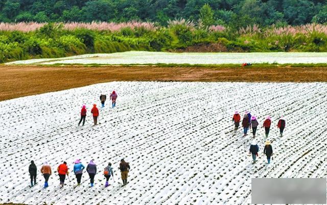 田间地头,农户们或弯腰培土,或俯身察看苗情,五彩衣衫在连绵的银色地膜映衬下格外醒目。整齐排列的地膜如银色琴键般延伸至远山脚下,与远处郁郁葱葱的山林相映成趣,构成霜降时节特有的农耕画卷。