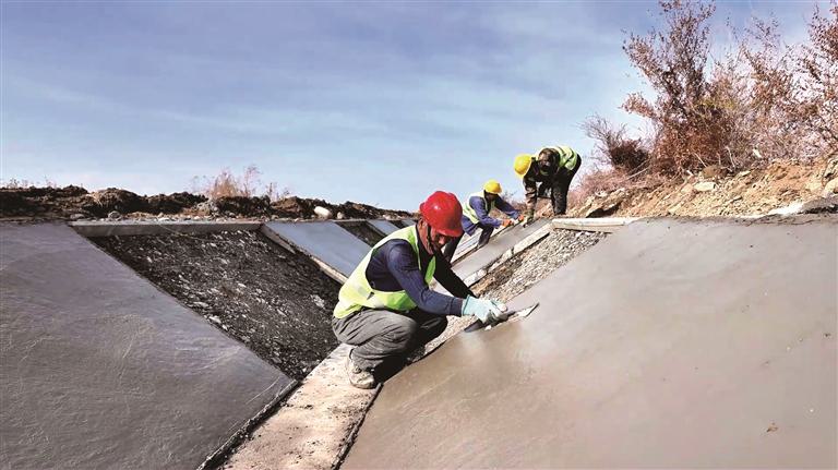 近日,玛纳斯县乐土驿镇高标准农田配套斗渠建设现场,工人在进行浇筑边板作业。□朱文斌摄