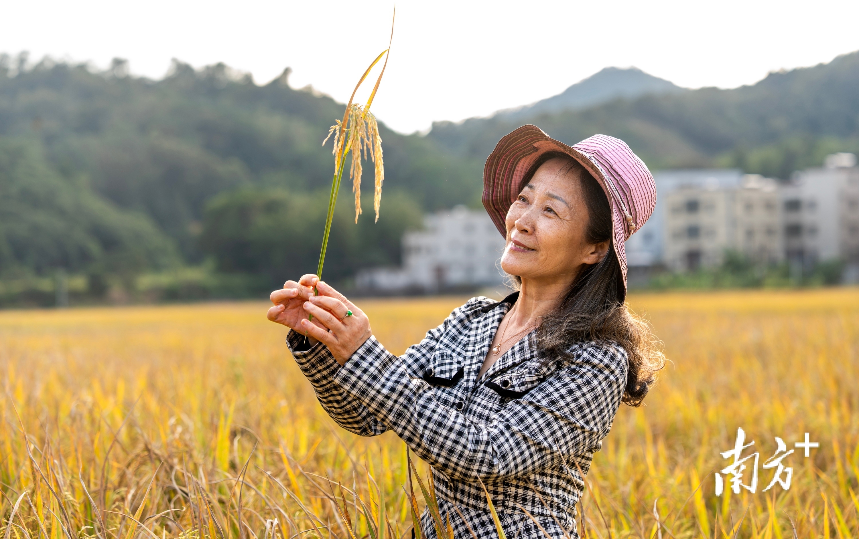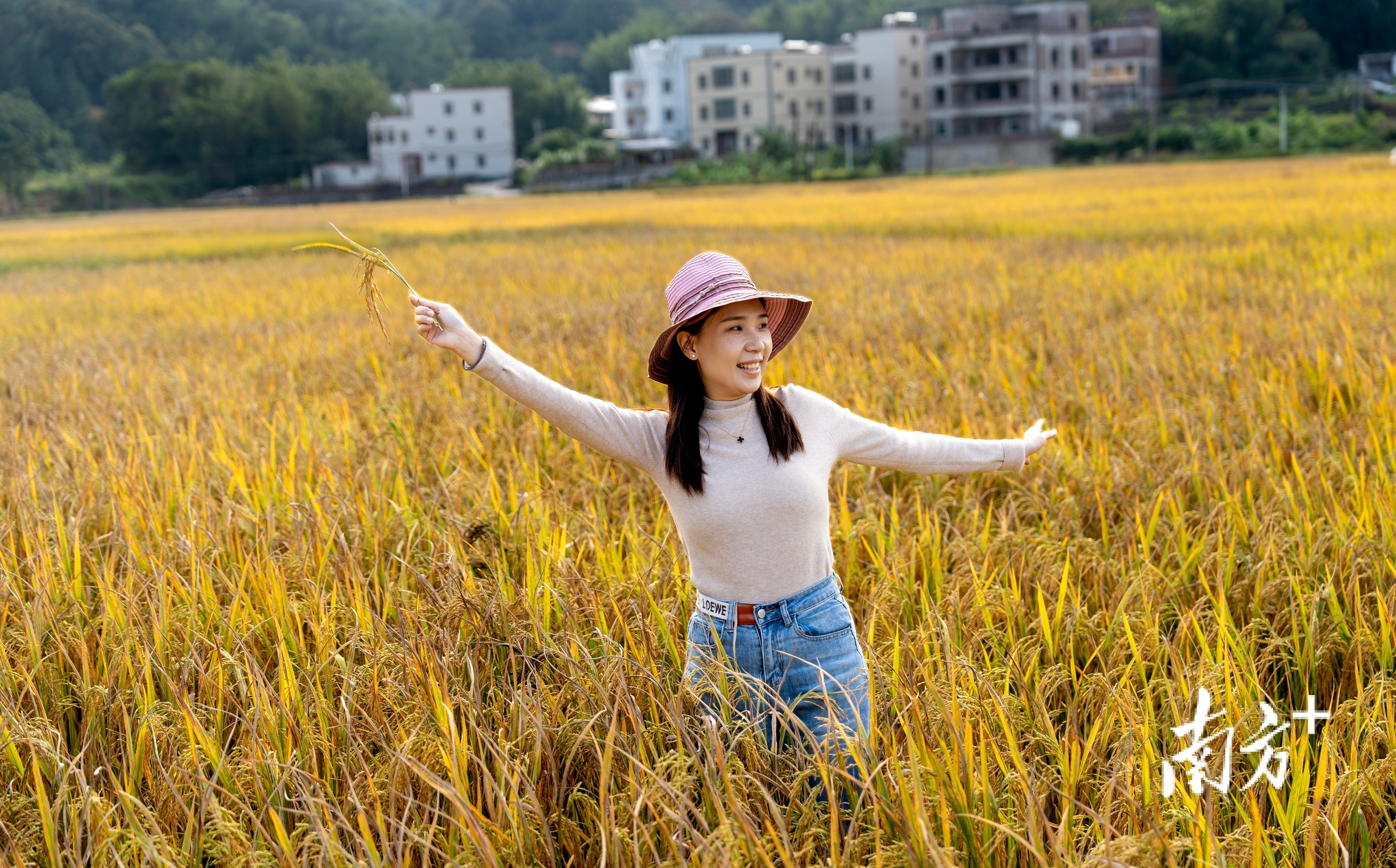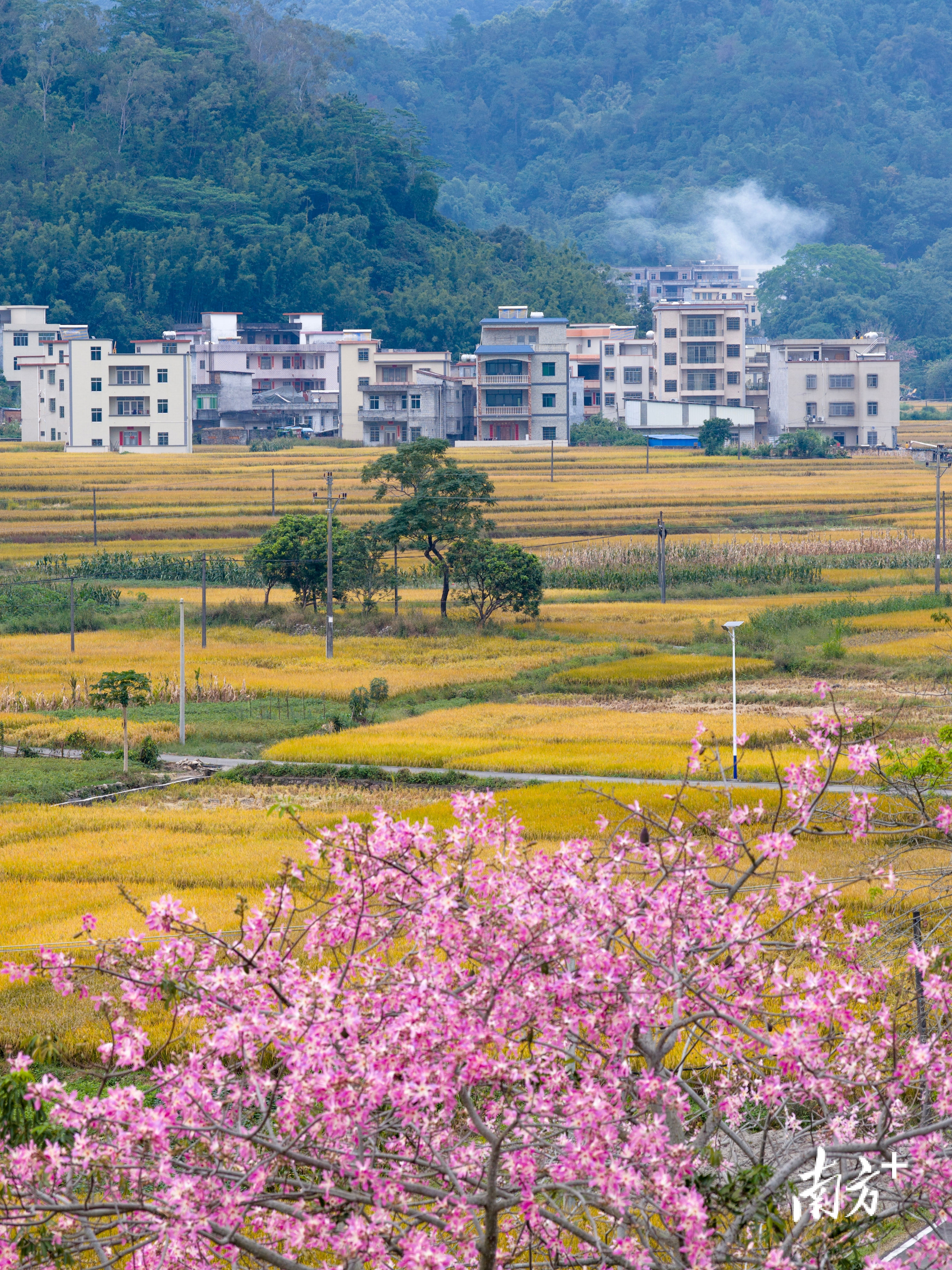 尤为引人注目的是,田边路旁一棵粉色的紫荆树正恣意盛放,娇艳的色彩与无垠的金色稻田形成鲜明而温柔的对比,也为厚重的秋色注入了一抹灵动与浪漫。