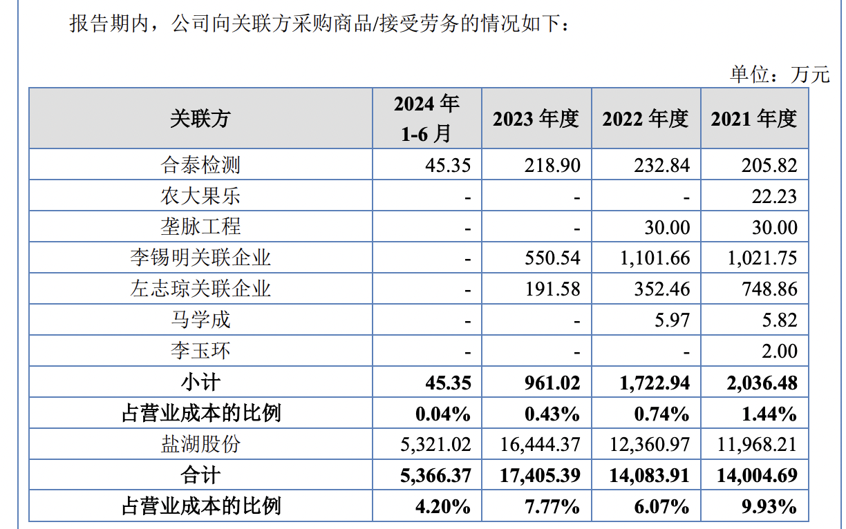 报告期内,农大科技向关联方采购商品/接受劳务金额合计分别为1.4亿元、1.41亿元、1.74亿元和5366.37万元,占各期营业成本的比重分别为9.93%、6.07%、7.77%和4.20%。其中,公司向关联方合泰检测采购金额分别为205.82万元、232.84万元、218.90万元及45.35万元。