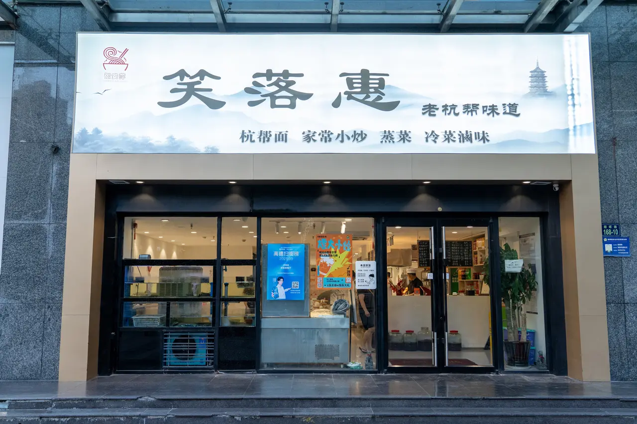 “笑落惠”开在杭州朝晖路的钛合国际,主做杭帮面和炒菜,开业一年多来,成了不少街坊邻居常来的饭馆。笑落惠的店内亮堂堂的,进门右手边就是点餐区和鲜货明档。