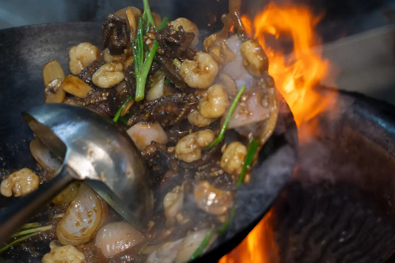 猪油润过的面,再经过炒制,香上加香。腰花外脆里嫩,虾仁微微焦黄,面筋道干香。虾爆鳝拌川张安萍也有自己的一套做法。“我们的虾爆鳝拌川,黄鳝特地留了骨,而且做成了反骨鳝。”黄鳝掐头去尾,用刀拍松拍扁后入油锅炸,高温下的鳝段边缘就会反卷弯曲,这就是反骨鳝。大油锅炸过后的反骨鳝外酥里嫩,更加脆、香。