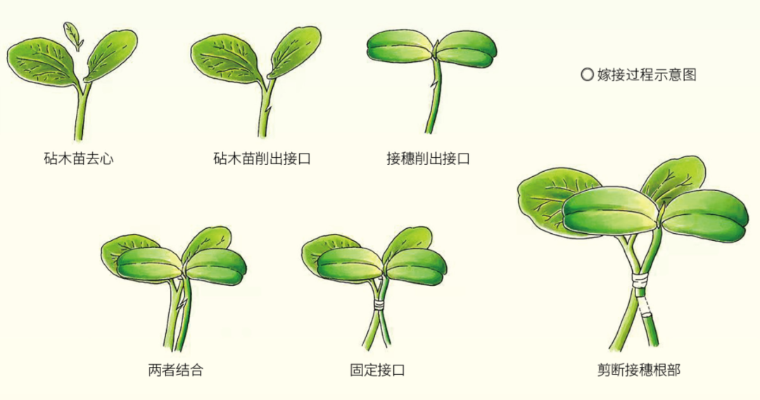 首先,他们要解决的就是光合作用的问题。为此,他们想出一个好办法——嫁接,也就是在主藤蔓上再嫁接上多个藤蔓(有时可达十余条),这样就可以有更多的叶片为南瓜提供光合产物。嫁接需要砧木和接穗,接上去的枝条或芽称为接穗,被接的部分叫砧木或台木。其原理很简单,就是让彼此的输导组织(在植物体中运输水分和各种营养物质的维管组织)对接。