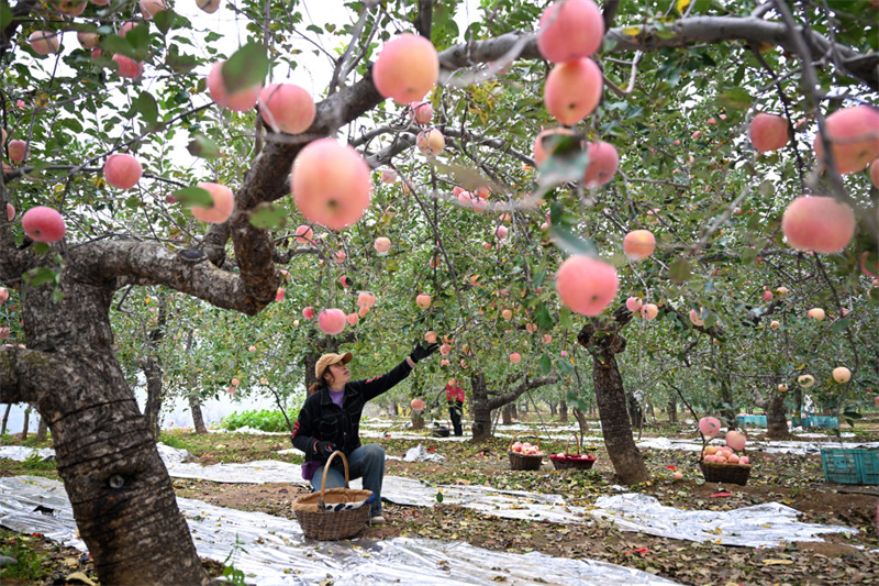 11月5日,在内丘县岗底村苹果种植基地,果农正采收苹果。