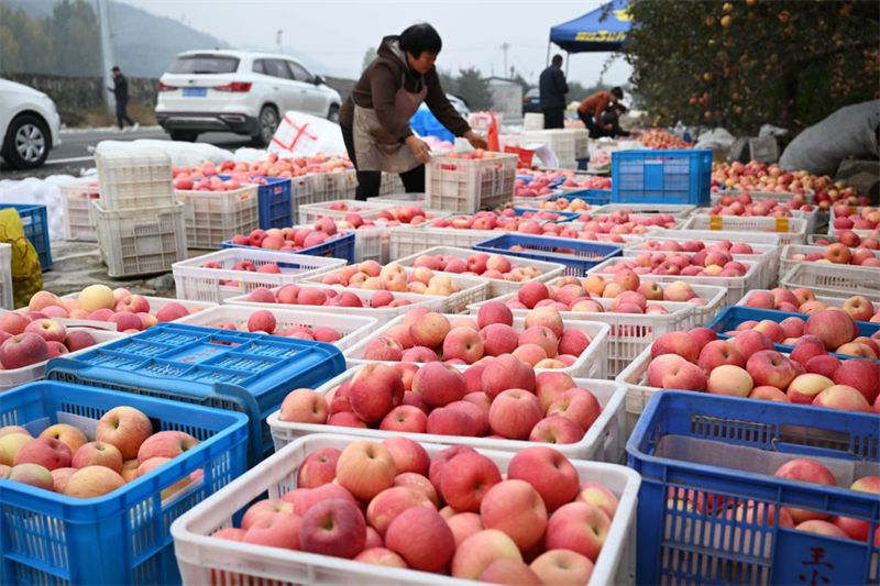 11月5日,在内丘县岗底村苹果种植基地,果农准备将苹果装车外运。