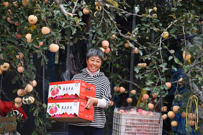 11月5日,在内丘县岗底村苹果种植基地,网红果农刘海燕正直播销售苹果。