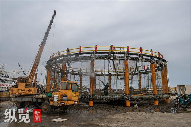 10月24日,唐山海洋牧场实业有限公司工人正在清理保养智能网箱。