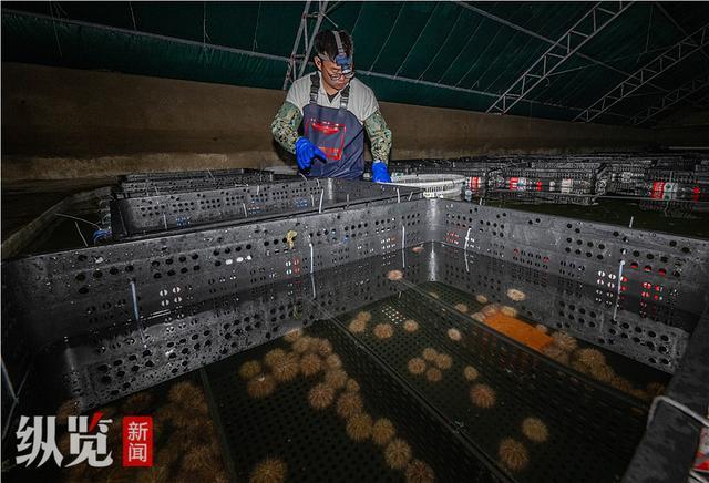 10月22日,乐亭隆伟海洋牧场有限公司,技术人员正在大棚内试养海胆。