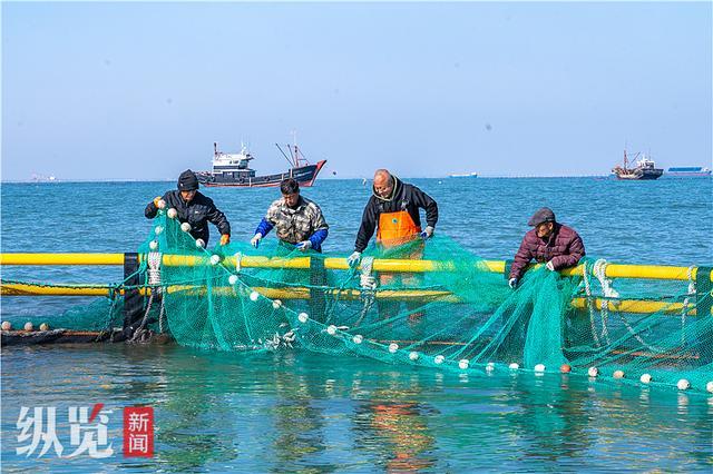 10月22日,乐亭县海洋牧场,渔民正在捕捞网箱培育的绿鳍马面鲀。
