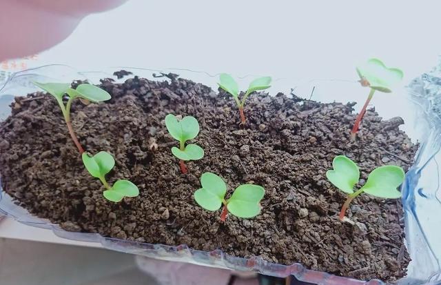 生菜的发芽率高,发芽速度快,把盆土弄得细腻一点,不要太板结,种子撒下之后,一周就能出苗了,小苗长得拥挤了,就要拔掉一些,保持一定的间距,它们才能顺利生长,小苗长得更壮实一些。