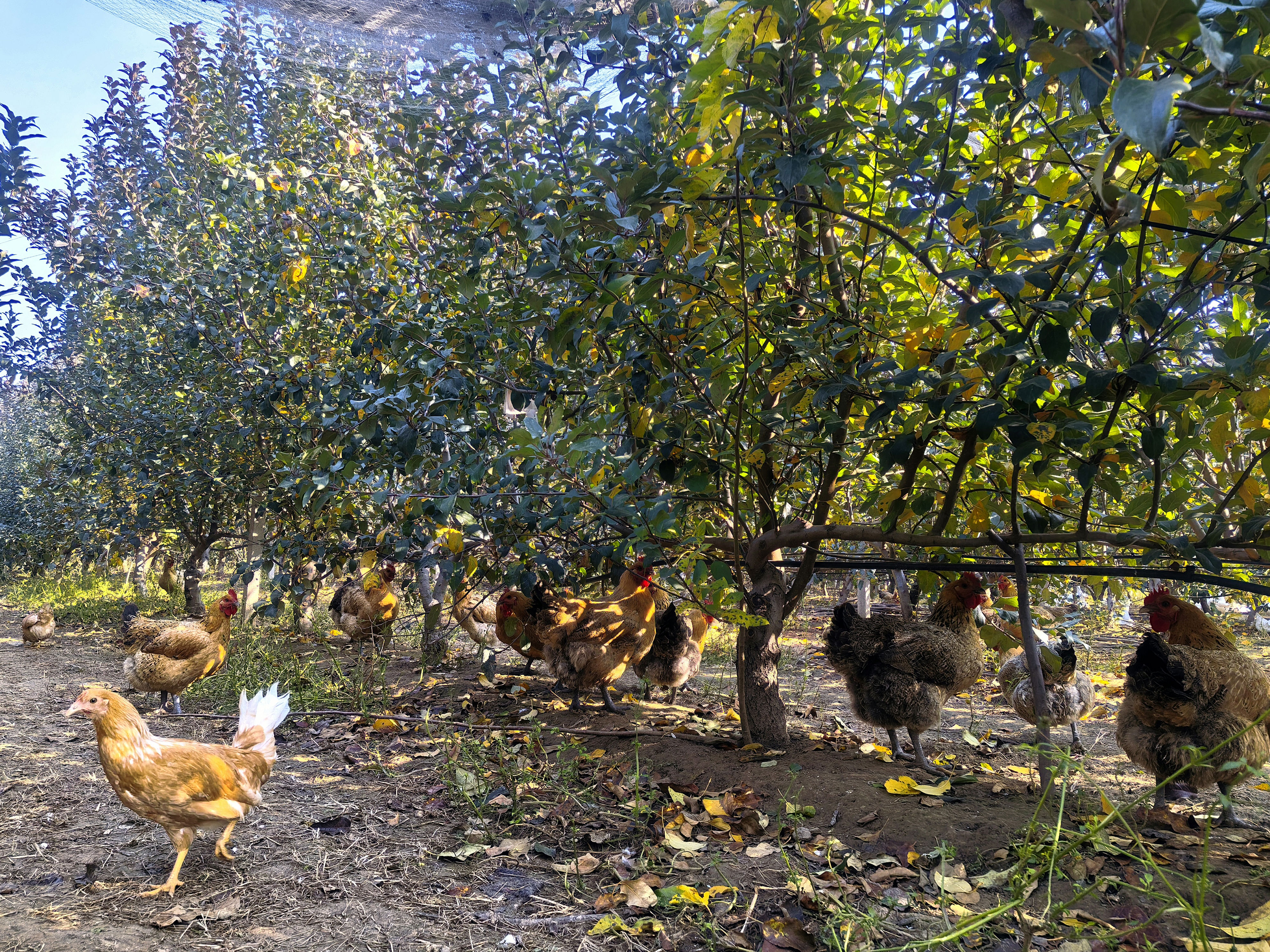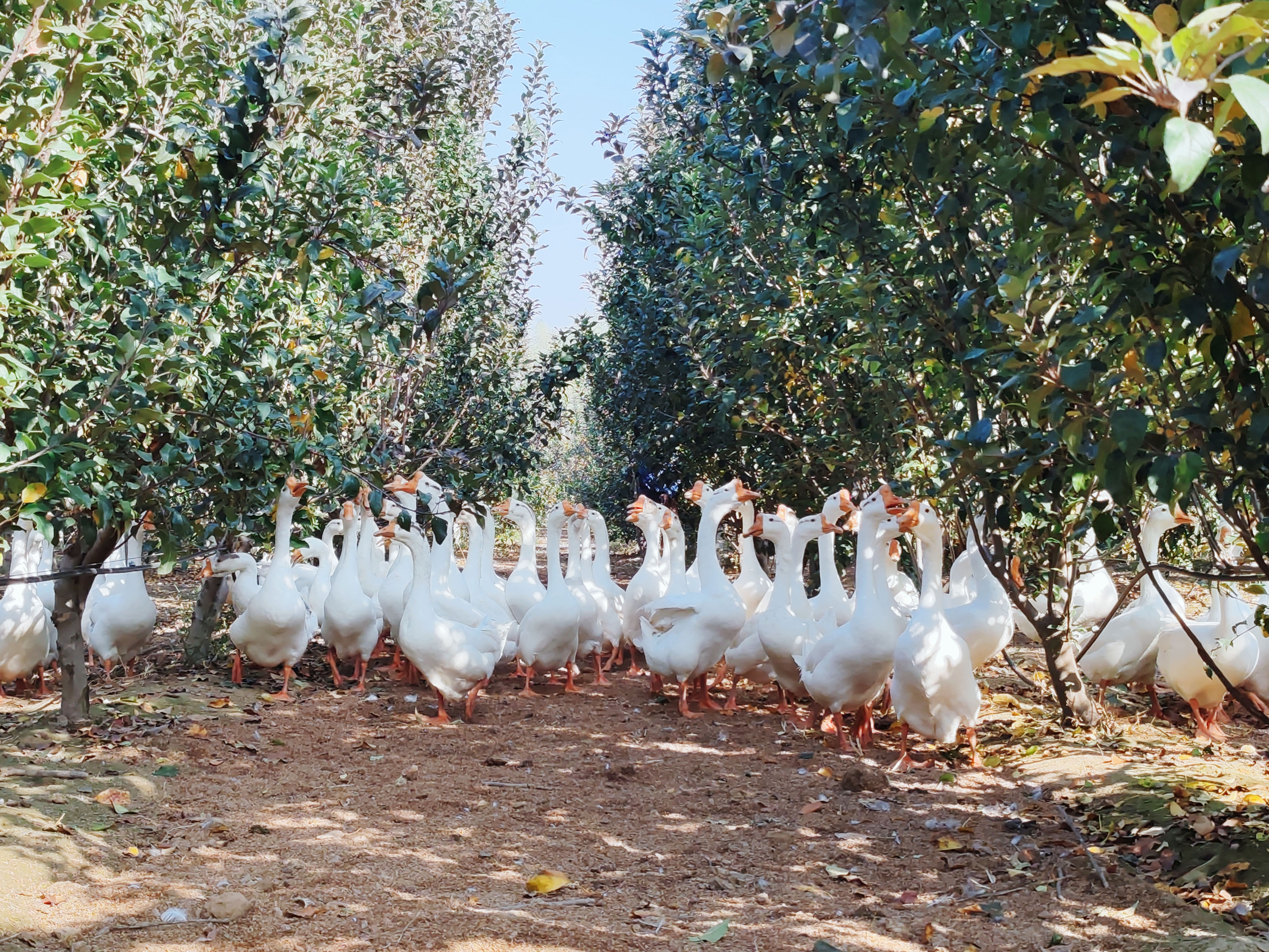 创业之路布满荆棘:初期夫妻俩几乎踩遍所有“坑”,盲目引进3000只鸡苗,因密度过大引发球虫病,一夜死掉500只;首年挂果时遭遇冰雹,30%果实被打伤受损,被迫低价抛售。汲取教训后,通过学习引进水肥一体化系统,安装pH值传感器调节灌溉系统,节水率50%。在禽类生态位设计上,鸡、鹅以林地杂草、昆虫为天然饲料,减少饲料投入的同时,粪便可作为林地有机肥,改善土壤肥力,实现“以牧促林、以林养牧”的良性循环,构建起“种植+养殖”的立体循环模式。王韬亮摸着刚安装的防雹网说:“农业不能靠天吃饭,得靠科技和韧性,才能筑牢增收根基。”
