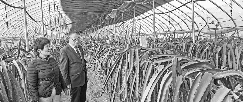 图为在耀州区王家砭村的温室大棚里,返乡农民张改玲与农行客户经理一同查看火龙果长势。