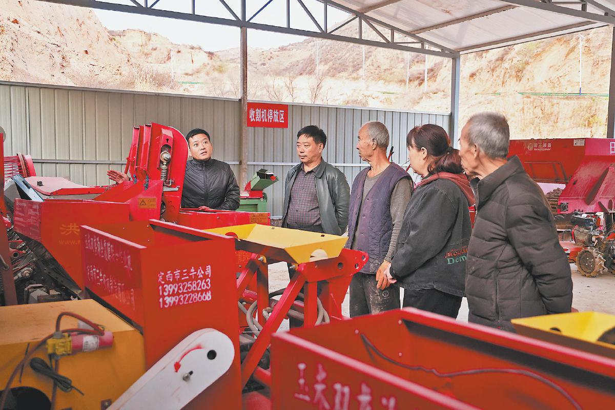 子洲县农业机械推广站工作人员向农民介绍农业机械。 马哲 摄