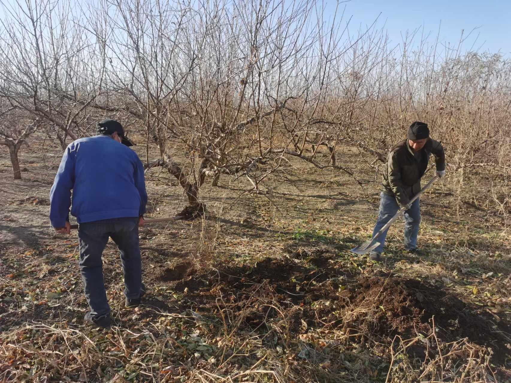冬季是桃树积累养分、恢复树势的关键时期。在桃园内,经验丰富的果农们正严格按照技术规程进行操作。他们选用充分腐熟的羊粪、牛粪等优质农家肥作为桃树的“越冬口粮”,在树冠外围开挖深沟,将有机肥与适量复合肥混合后均匀施入并覆土。“这就像给桃树吃了一顿‘营养大餐’,不仅能提高抗冻能力,还能改良土壤,让来年开花结果更有劲头。”拥有十几年种植经验的李淑海一边劳作一边介绍。