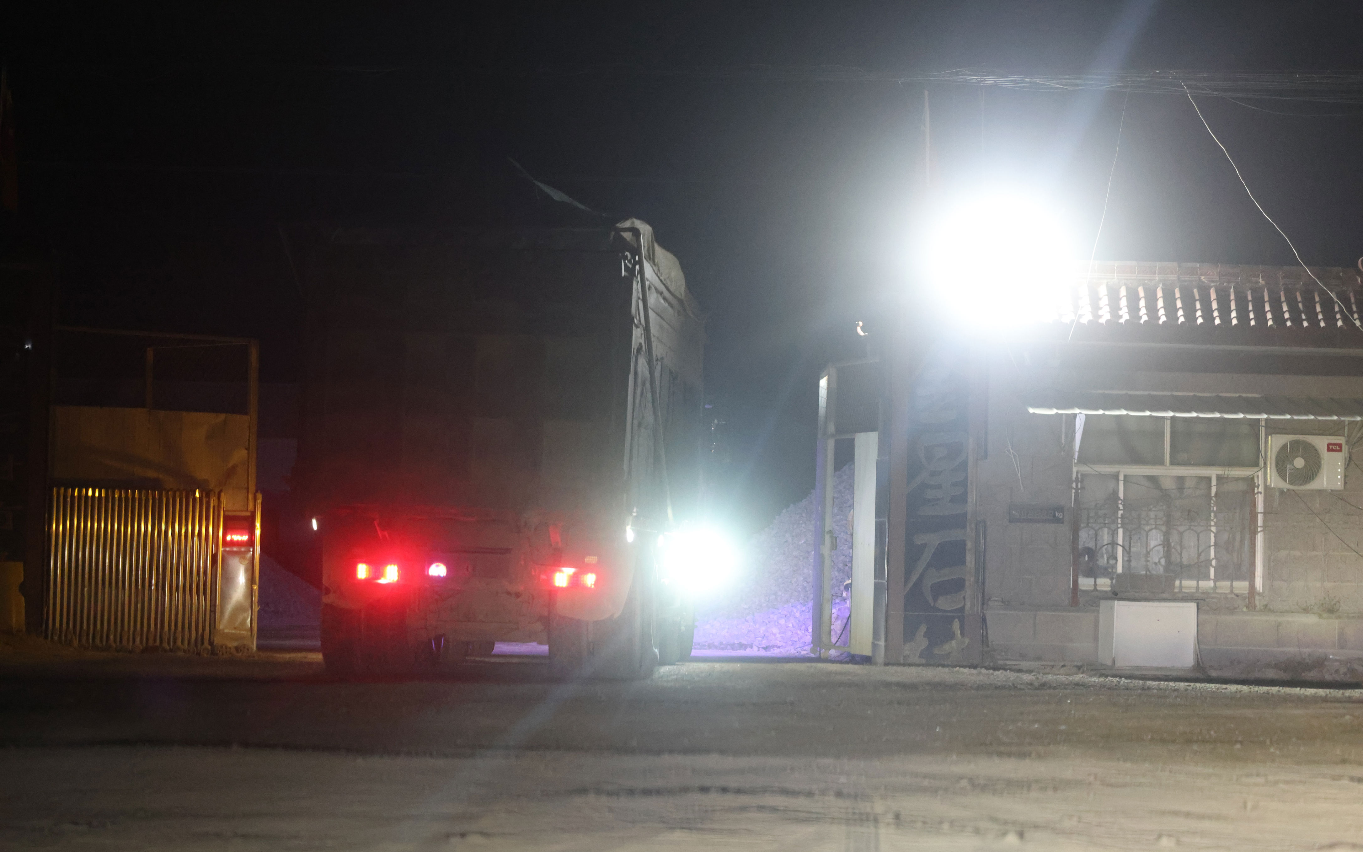 11月27日晚,一辆货车满载圣泉生态公司所开采的矿石,驶进平邑县金星石材公司。 新京报记者 李英强 摄