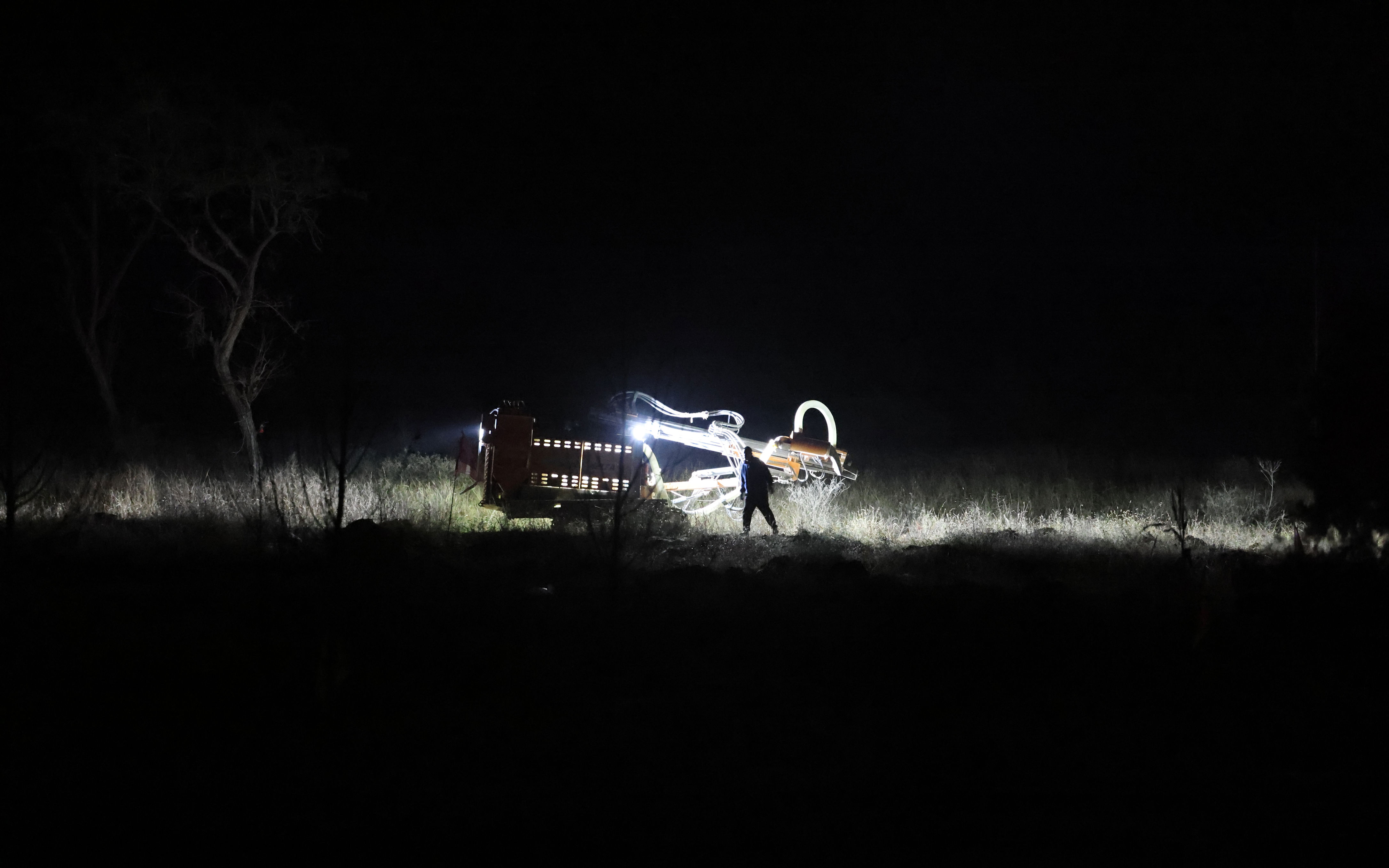 11月28日晚8时,圣泉生态公司养殖场内两台铲车正在开采矿石。 新京报记者 李英强 摄