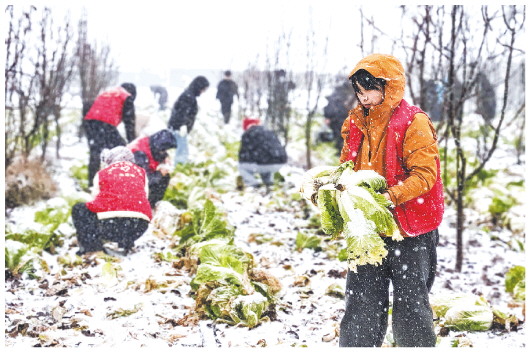 12月2日上午,雪花纷飞,寒亭区农美果蔬种植合作社的白菜地里,却是一派热火朝天的景象。山东畜牧兽医职业学院65名师生组成志愿服务队,冒着低温与寒雪,深入田间地头,帮助合作社农户紧急抢收白菜共计4万斤,确保蔬菜及时入仓,最大限度避免冻害损失(如图)。
