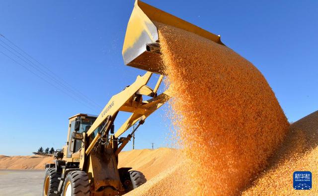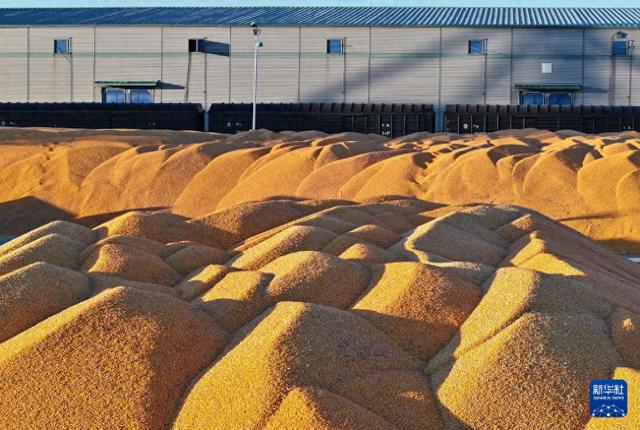 10月23日,在北大荒集团黑龙江格球山农场有限公司一烘干厂,工人驾驶铲车在管理烘干的玉米。